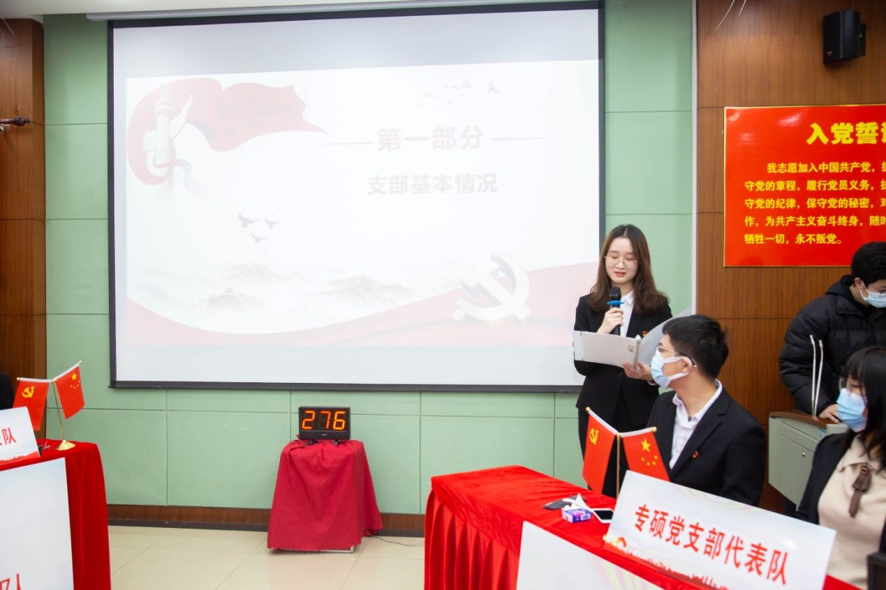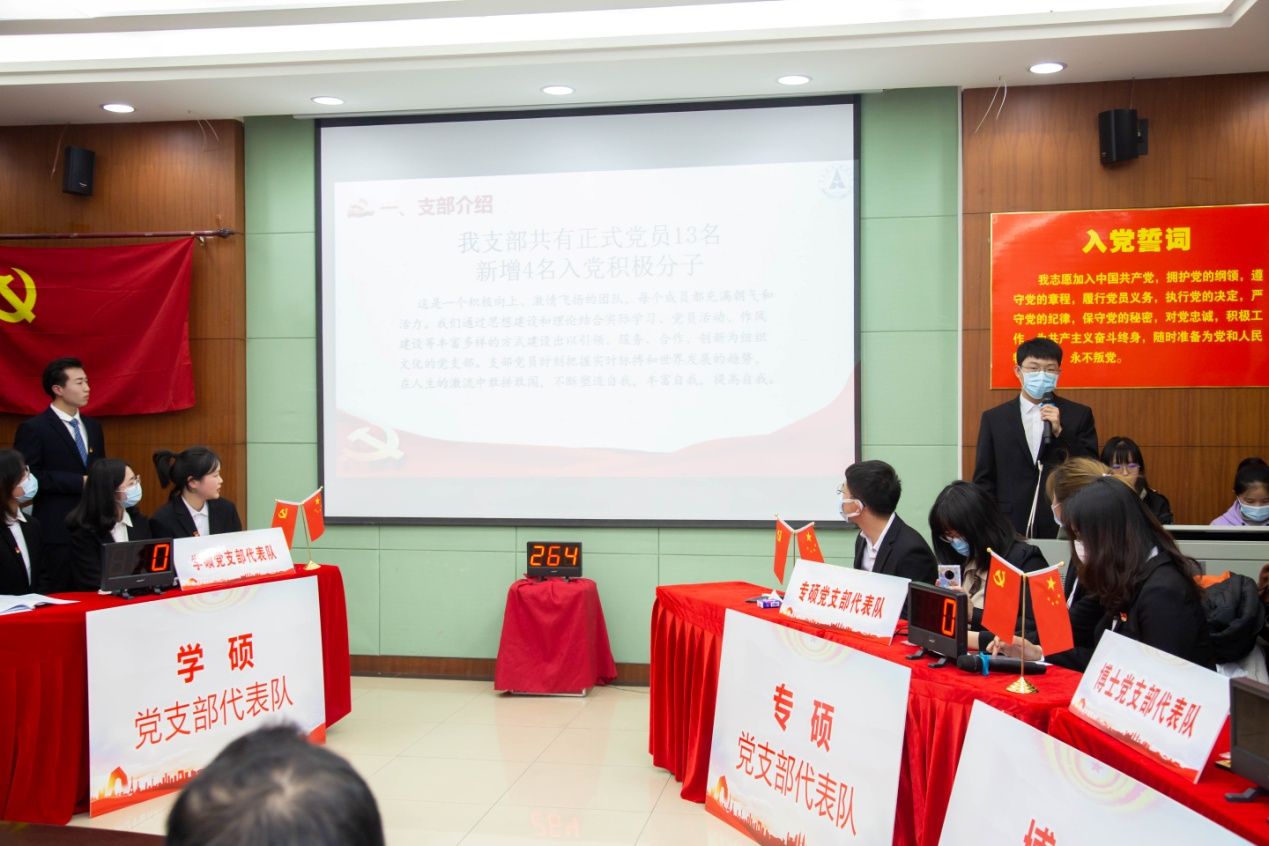 在“党支部风采展示”环节,本科2017级学生党支部从“对标先进,追求卓越”、“坚韧意志、树立典型”、“继往开来,再创佳绩”三个方面展示支部风采;学硕党支部通过视频的方式展现了支部学习党建知识的多种方式和显著成效;博士党支部深入介绍了支部理论学习和相关活动,展现了“引领、服务、合作、创新”的党支部文化。比赛现场展示形式多样,精彩纷呈。