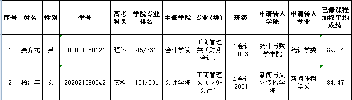 根据《米兰电竞·(中国区)本科生调整修读专业管理办法(修订)》(中南大教字[2017]17号)文件精神和《关于做好2020级普通本科学生调整修读专业(类)工作的通知》要求,经审核,我院以下学生符合申请调整修读专业的要求,现予以公示。公示时间为2021年3月8日-10日。如有异议,请于2021年3月10日16:00点前将复议申请以书面形式交到文泉楼南307(会计学院教学办)。