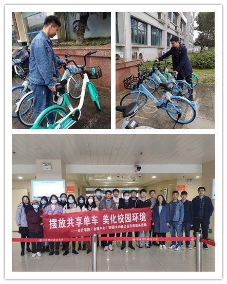 “摆放共享单车 美化校园环境”小分队对文澴楼周边乱停乱放、倾斜倒地的共享单车进行了统一规范整理,并对共享单车内的残留垃圾、粘贴的小广告做了清理工作。(文/杭慧喆)