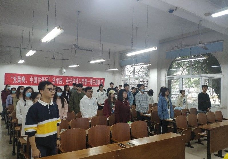 为进一步加强学校共青团队伍建设,为团组织注入新鲜力量,同时在发展过程中突出政治标准,严格发展程序,进一步提高发展团员质量,会计学院、法学院于10月10日在文澜楼105教室开展“光荣啊,中国共青团”入团第一课主题教育。