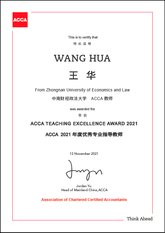 ACCA每两年在全国范围内评选一次优秀教师,本次获奖显示出我院强大的ACCA师资力量。会计学院自2005年开设ACCA建制班,探索将职业资格教育与本科学历教育相结合的国际化教育方式以来,ACCA学员的全球考通过率名列前茅,14人次获得大陆单科第一,毕业生出国深造人数多、占比高,选择就业的毕业生也越来越受到雇主单位的认可。会计学院于2015年获评黄金级教育机构,2018年获评白金级教育机构。
