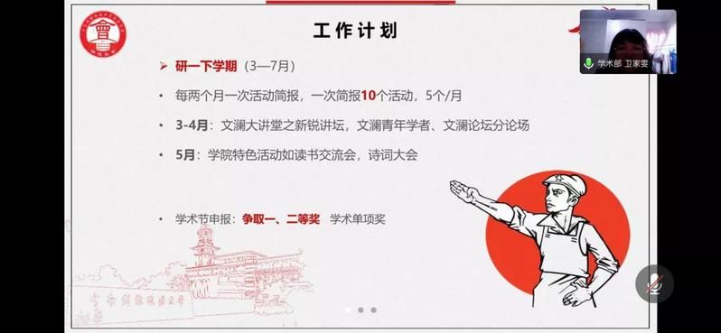 会议开始,主持人首先对杭慧喆老师以及各位部门负责人的参会表示感谢。接下来,各部门负责人及各分管主席对第一学期的工作做出了概述,总结了工作过程中遇到的困难以及解决办法,并与其他部门负责人交流了经验。