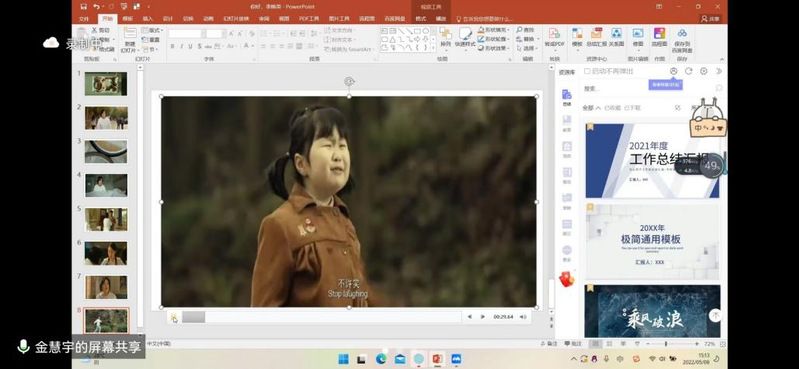 中午13:50,志愿者就已经提前进入了腾讯会议,按照之前彩排的流程调试设备、梳理讲稿。14:00整,小朋友们在老师的组织下有序进入会议,活动就此展开。此次活动围绕“温情五月,感恩母爱”的主题,主要以讲解影片“你好,李焕英”、“来自星星的妈妈”和赏析歌曲“鲁冰花”、诗歌“游子吟”为主。