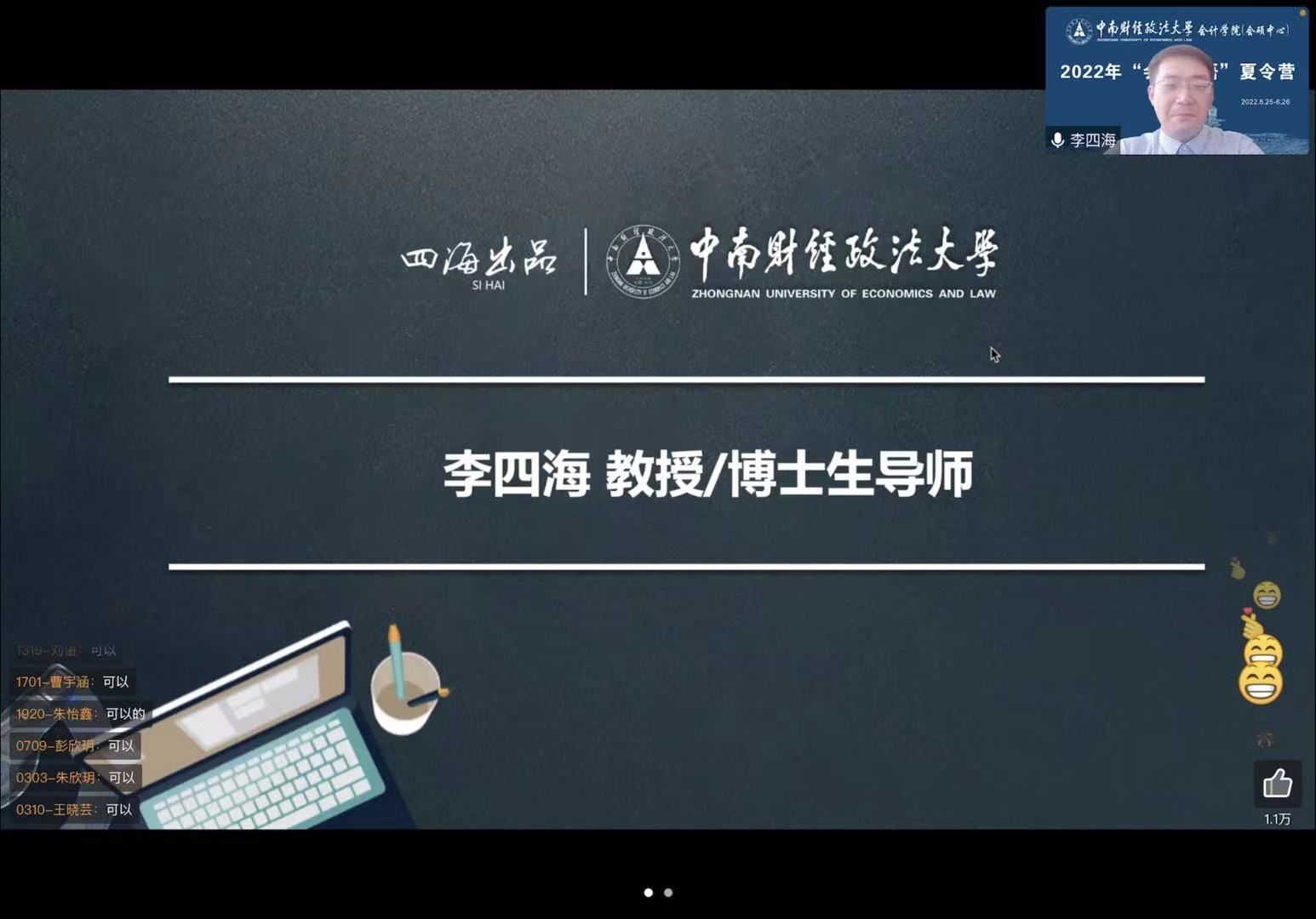 6月25日上午9点30分,2022年“会人会语”文澜优秀大学生夏令营学术报告会在线上平台拉开帷幕,会计学院副院长,教授,博士生导师李四海老师做了第一场学术报告《击穿报表:风动与幡动》,会计学院副院长陈丽红教授主持本场学术报告会,近500多名师生参加了此次活动,同学们热情高涨,认真聆听着李四海教授的报告,并积极发表自己的意见与看法。