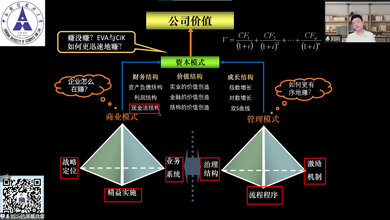 另外,刘圻教授向同学们分享了独到的商业框架,从商业模式切入,结合管理模式,突出选择与差异性的重要性,从财务结构、价值结构、成长结构等特点考量资本模式,从而影响公司价值。