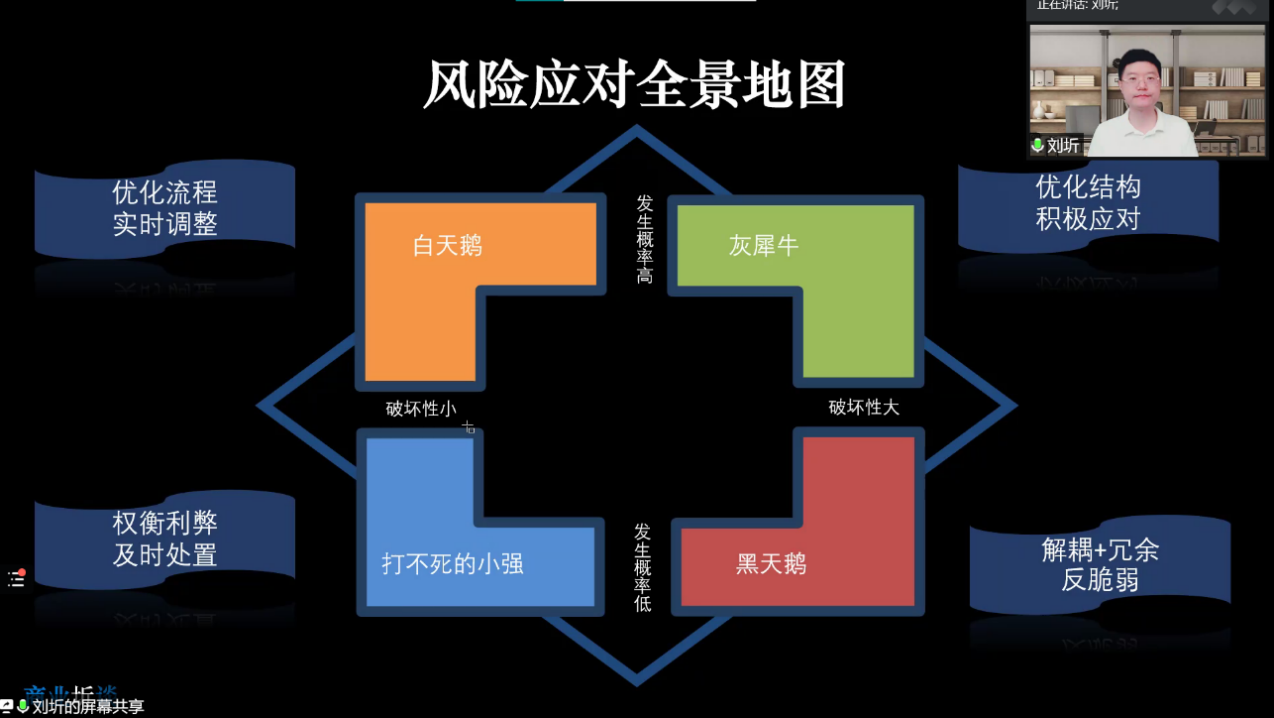 其次,刘圻教授以机会管理全景地图为出发点,从收益与发生概率角度进行机会分析,指出风险管理强调冗余,机会管理强调小规模试错等特点。当面临不确定时,企业应当进行小规模试错,规模投放,持续优化等商业策略,以提高资源效率。