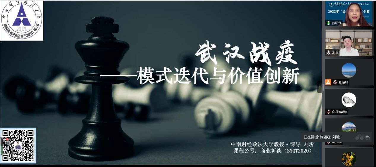 为给广大优秀大学生提供学术交流平台,展示我校雄厚学术师资力量,2022年6月26日上午8时,第九届“会人会语”文澜优秀大学生夏令营学术报告会在线上继续进行,米兰电竞·(中国区)会计学院教授、博士生导师刘圻教授以《武汉战疫——模式迭代与价值创新》为主题进行学术报告,会计学院副院长陈丽红教授主持本场学术报告会,同学们积极参与讨论与学习,热情高涨。