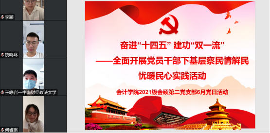 2022年6月21日,会计学院2021级会硕第二党支部在线上开展了以“奋进‘十四五’ 建功‘双一流’——全面开展党员干部下基层查民情解民忧暖民心实践活动”为主题的党日活动。本次活动由支部书记王佳媛主持。