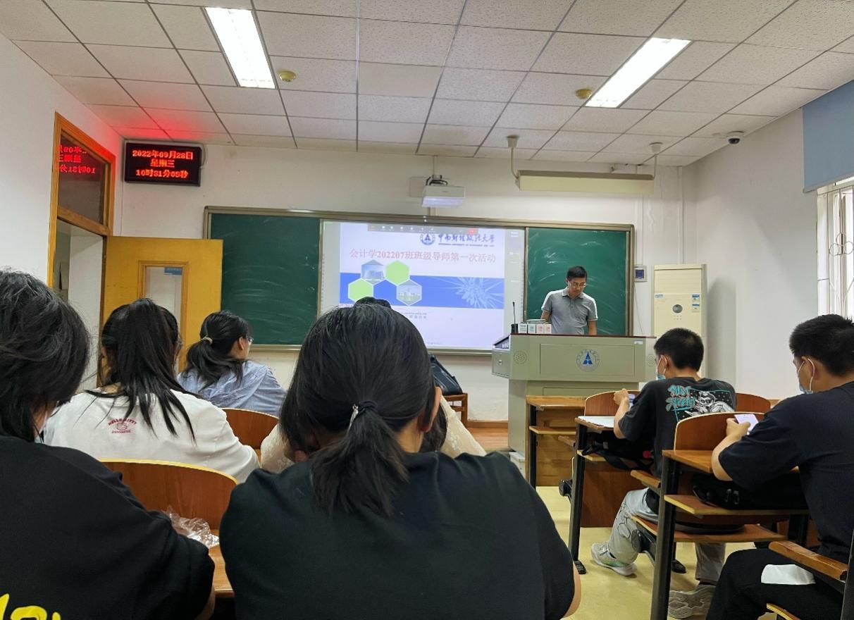 首先,班级导师王昌锐老师进行自我介绍。王昌锐老师以自己的求学经历和工作经历为粗线条,简要介绍了自己的成长之路,并结合会计学院的组织架构,重点介绍了自己目前作为双肩挑人员所主要承担的工作,以及作为会计学2207班班级导师未来四年的基本规划。