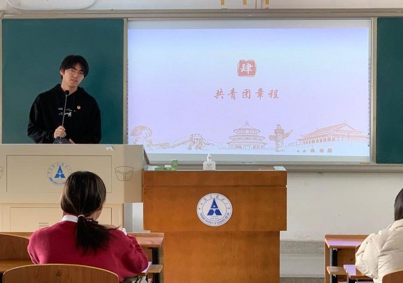 第一阶段,首先,由法学院团委组织部基层工作部部长古文韬讲述共青团的入团程序、条件以及发展历程。然后,由会计学院团委组织部基层工作部部长陈濯带领学员学习共青团章程、组织原则和三会两制一课制度。