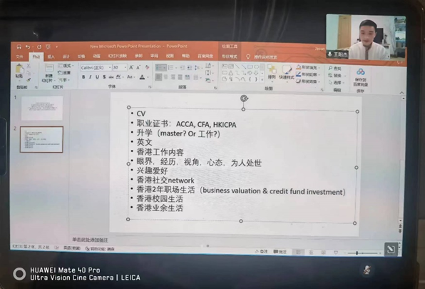 王阳杰首先分享了自己在ACCA学习中的收获,并以自身的经历讲述了在香港中文大学求学、香港工作以及生活的心得体会,强调了主动学习、良好的心态以及建立Network的重要性,引人入胜。
