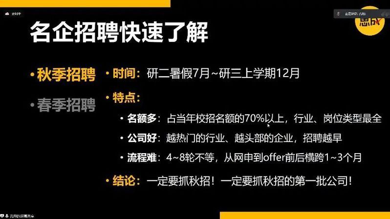 孔翔老师首先介绍了名企招聘的两个核心期——秋季招聘和春季招聘。秋季招聘时间一般从暑假7月开始到12月,特点是名额多、公司好、流程复杂;春季招聘作为秋招的补招,名额较少、流程较短。因此,老师提醒同学们一定要抓住秋招的机会;同时,也可以多关注作为秋招提前批的暑期可转正实习。