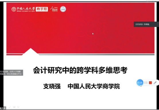 为进一步提高我院研究型人才的学术素养,完善学术交流机制,提高学生对于知识和技能的应用与实践,增进学科各领域之间的联系,2023年2月20日晚上19点,会计学院第十期科教融合育人大讲堂在云端隆重开讲。我院诚挚邀请中国人民大学商学院教授、博士生导师、全国会计专业学位研究生教育指导委员会秘书长支晓强教授作为主讲嘉宾,以“会计研究中的跨学科多维思考”为主题,面向会计学院师生作了一场高水平的学术讲座。本场讲座由会计学院院长张敦力教授和副院长陈丽红教授共同主持,300余名硕博研究生及教师学者参加了本次讲座。