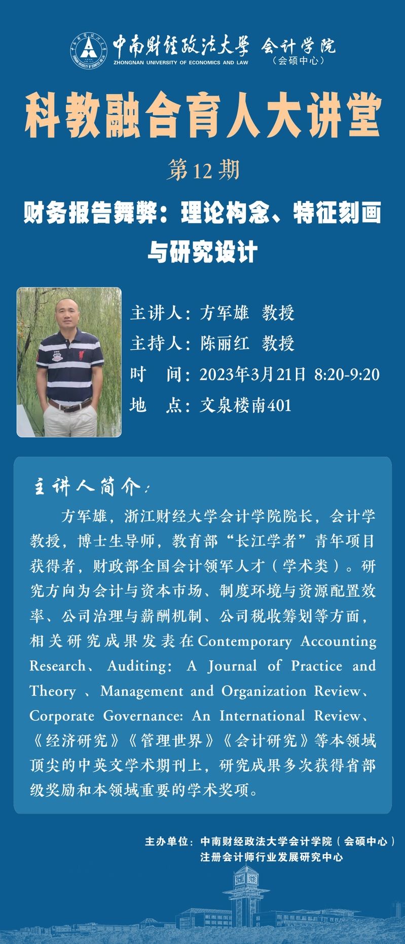 本次我们诚挚邀请浙江财经大学会计学院院长方军雄教授作为主讲嘉宾,为我们带来第12期科教融合育人大讲堂。