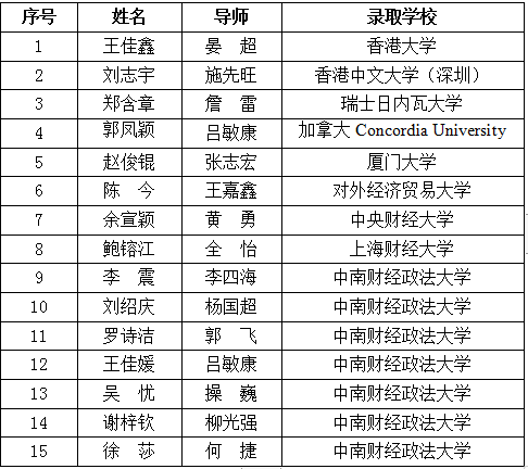 在学校大力推进“双一流”建设和深入实施研究生培养质量提升工程的背景下,我院研究生科研成果不断涌现,学术氛围愈加浓郁,学生学术志趣被大大激发,2023届硕士研究生考博再创佳绩。据统计,截至目前已有15名全日制硕士研究生被拟录取为博士研究生,录取学校有香港大学、香港中文大学(深圳)、瑞士日内瓦大学、加拿大Concordia University、厦门大学、对外经济贸易大学、中央财经大学、上海财经大学、米兰电竞·(中国区)等。