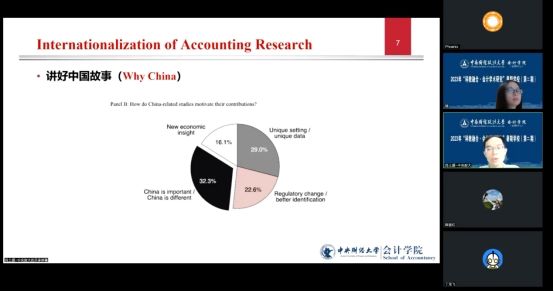 首先,在讲座的开始,肖土盛教授介绍了会计研究的国际发表情况。在前五大国际顶刊中,使用美国作为背景或数据来源的文章大约占到了90%,国际学术话语体系依旧以美国为主导。但是,随着中国经济影响力的攀升,中国研究在国际期刊中的发表数量正在逐年增加,中国数据的使用比例逐年增加。从国内学者的研究国际化发表中来看,审计领域的研究话题占比最多。接着,肖土盛教授讲述了如何利用中国数据进行国际期刊发表,讲好中国故事,并指出解释“Why China”的问题可以从以下四个方面着手:第一,中国有独特的数据,如审计师签字数据;第二,中国的管制政策为识别因果关系提供了一个很好的环境;第三,中国有独特的制度背景;第四,利用中国数据能够产生一些新发现。