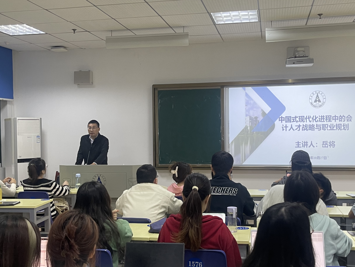 2023年10月27日晚19:00,领越锦城企业管理咨询有限公司总经理岳将先生受邀为我院专硕研究生讲授“中国式现代化进程中的会计人才战略与职业规划”专题讲座,本次讲座由会计学院会硕中心主任兼副院长王昌锐教授主持,2023级专硕研究生参加。