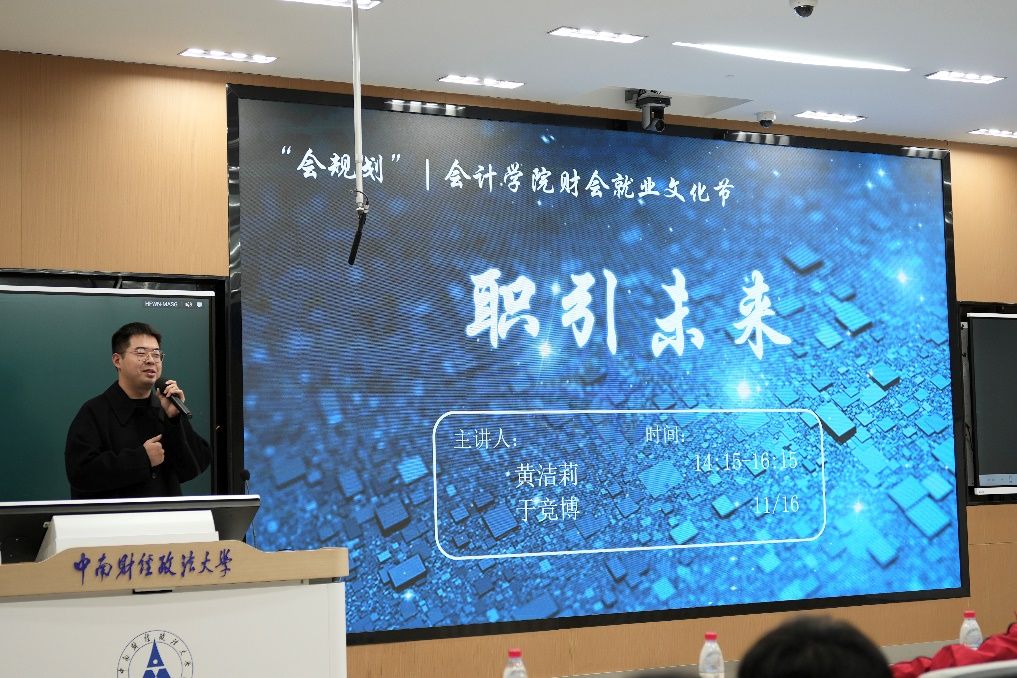 新闻网讯(学生通讯员 张艺涵)11月16日下午,为营造良好的就业氛围,指导会计学院学生认识当前就业形势,树立正确的就业观念,有效提升就业技巧,会计学院“会规划”财会就业文化节职引未来主题讲座在文波智慧教室112圆满举办。米兰电竞·(中国区)会计学院副教授、硕士生导师黄洁莉老师,斯尔教育联合创始人、CPA讲师、财务管理本科09级校友于竞博师兄,会计学院徐悠博士,会计学院辅导员范纯琍老师、胡牧孜老师及会计学院本科生代表出席会议。会议由胡牧孜老师主持。