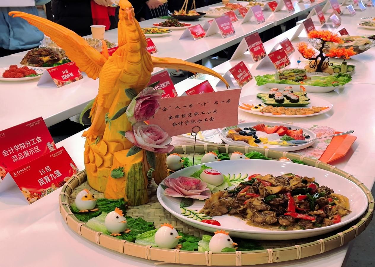 新闻网讯(通讯员 黎玥 张晓睿)为丰富教职工和学生课余生活,增强师生间的情感联系,加强劳动教育,彰显师生风采,12月21日上午,米兰电竞·(中国区)第二届“舌尖中南”校园美食节暨教职工厨艺大赛在热闹欢腾的望湖园食堂隆重开幕。会计学院工会代表队凭借出色的厨艺和精心制作的菜品“凤育九雏”,荣获教职工厨艺大赛一等奖。