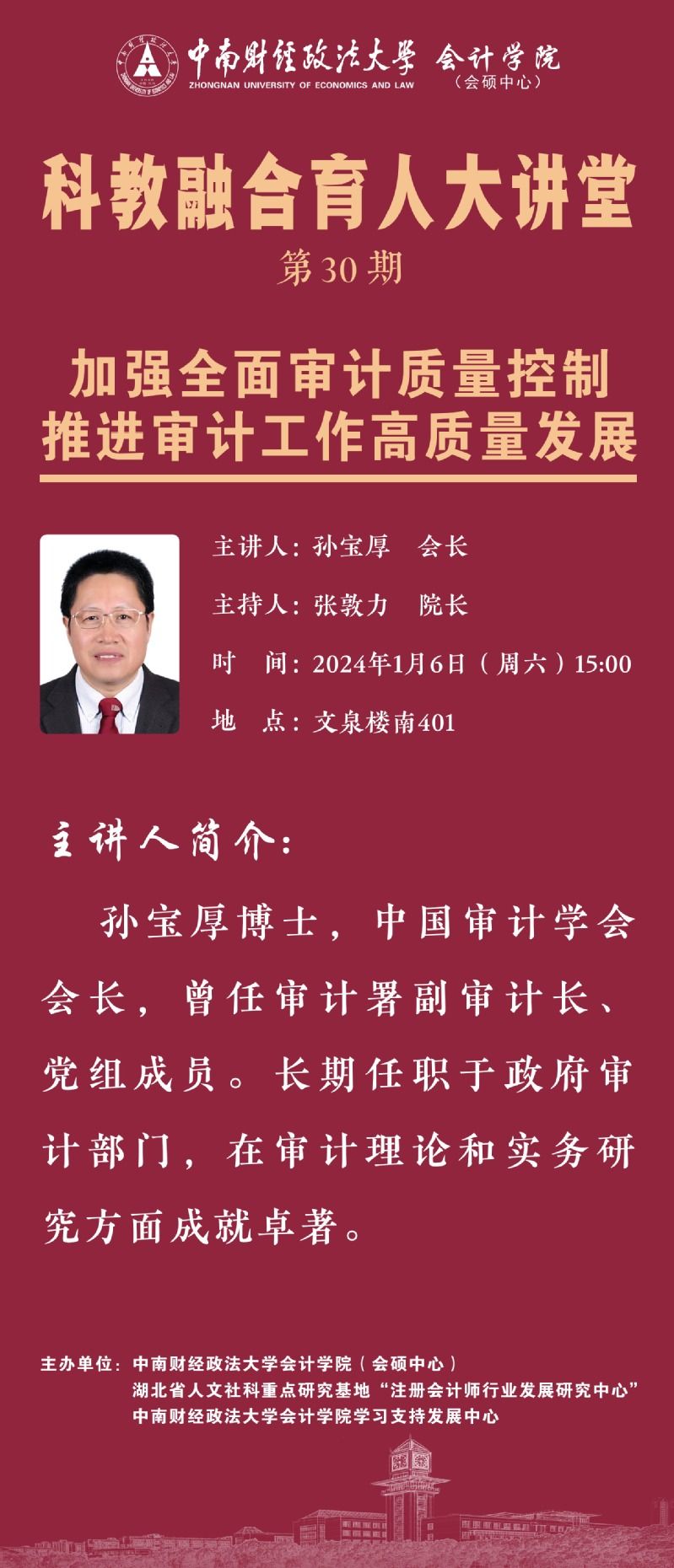 本次我们诚挚邀请中国审计学会会长孙宝厚博士作为主讲嘉宾,为我们带来第30期科教融合育人大讲堂。