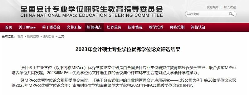 MPAcc优秀学位论文评选由全国会计专业学位研究生教育指导委员会指导,由联合发起单位成立组织委员会开展具体工作。经培养单位推荐、形式审查、匿名通讯评审、会议集中评审、组委会审批和公示等环节,共评选出26篇2023年全国MPAcc优秀学位论文。杨文豪学位论文的入选,充分展现了学院加强专业硕士学位论文和学位授予全过程质量管理的显著成效。
