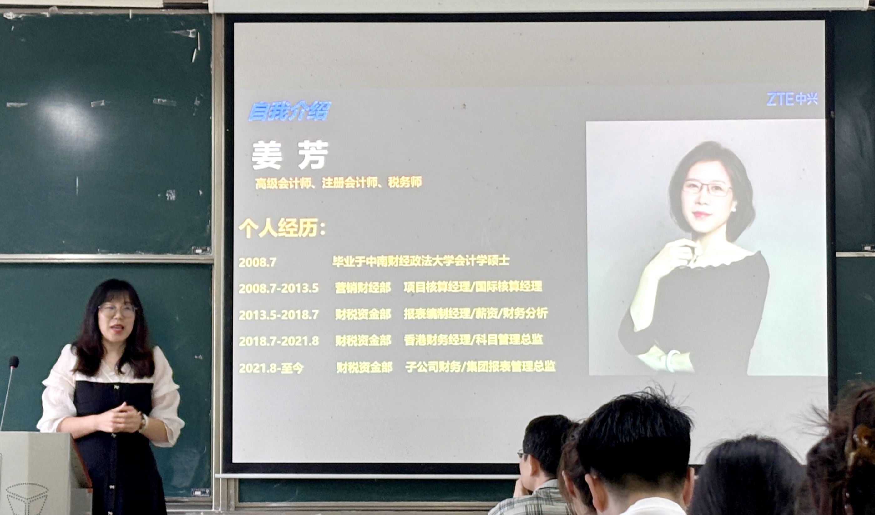 为促进同学们对行业发展趋势、前沿问题等有更深层次的了解,拓宽视野,增强专业素养和就业竞争力,5月23日上午,中兴通讯集团报表管理总监姜芳总监在文添楼102为《财会审前沿问题研究》课程的同学们进行授课。本次课程由专硕导师组组长季华副教授主持,主题为“集团核算管理”。