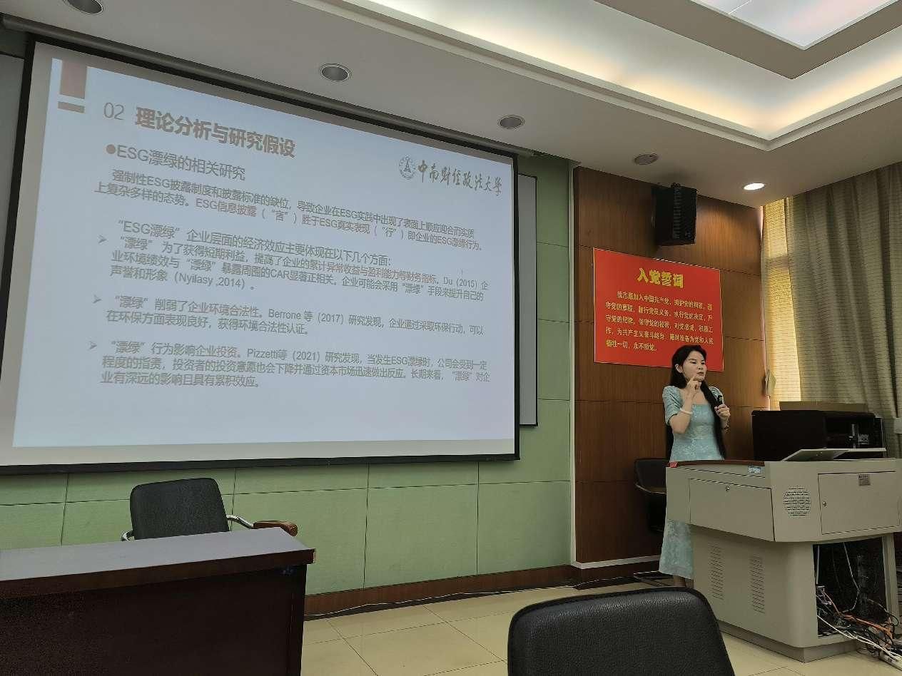 第三场活动,王颖同学分享其最新研究成果,论文名为“抑制亦或掩饰?ESG与大股东掏空行为”。该研究主要探究企业的ESG表现与大股东掏空行为之间存在的关系。研究得出如下结论:在其他条件不变的情况下,企业良好的ESG表现与大股东掏空行为之间存在负相关关系。这一结论在经过一系列稳健性检验后结论依然成立。机制研究发现,ESG通过提高企业良好声誉,激励员工以及优化ESG投资抑制了大股东掏空行为。异质性分析发现,未受监管处罚和媒体监督作用更强的企业,审计质量更高以及分析师关注度更高的企业,ESG抑制企业大股东掏空行为的治理作用更明显。