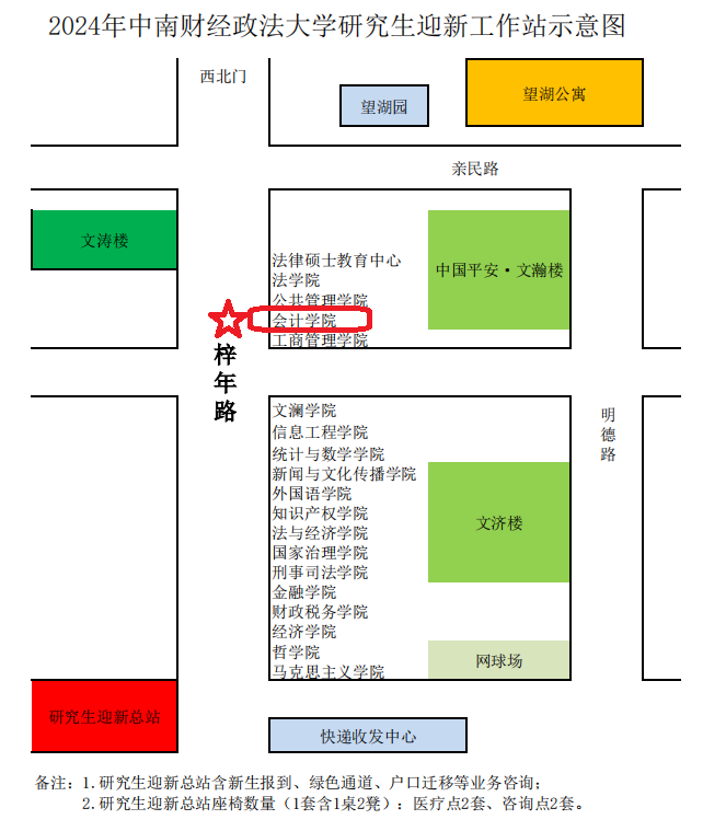 梓年路集中迎新区会计学院迎新点(校园巴士直达或西北门步行直达)