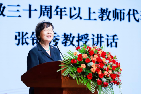 从教满三十周年的教师代表张锦秀教授向辛勤耕耘在教育一线的同仁们致以诚挚问候与热烈祝贺。她提到,正如陶行知先生所言,教师们捧心而来,无私奉献,其精神在今日得到最美彰显。张教授回顾了自己与会计学院的深厚渊源,从响应号召上山下乡到成为学院一员,知识改变了她的命运。半个世纪以来,她见证了学院的成长与辉煌,感恩学院给予的荣誉与支持。最后,她强调,良好的师风师德是教育的根本,作为教师,应不忘初心,继续前行,即使退休也要积极贡献余热,传递正能量。