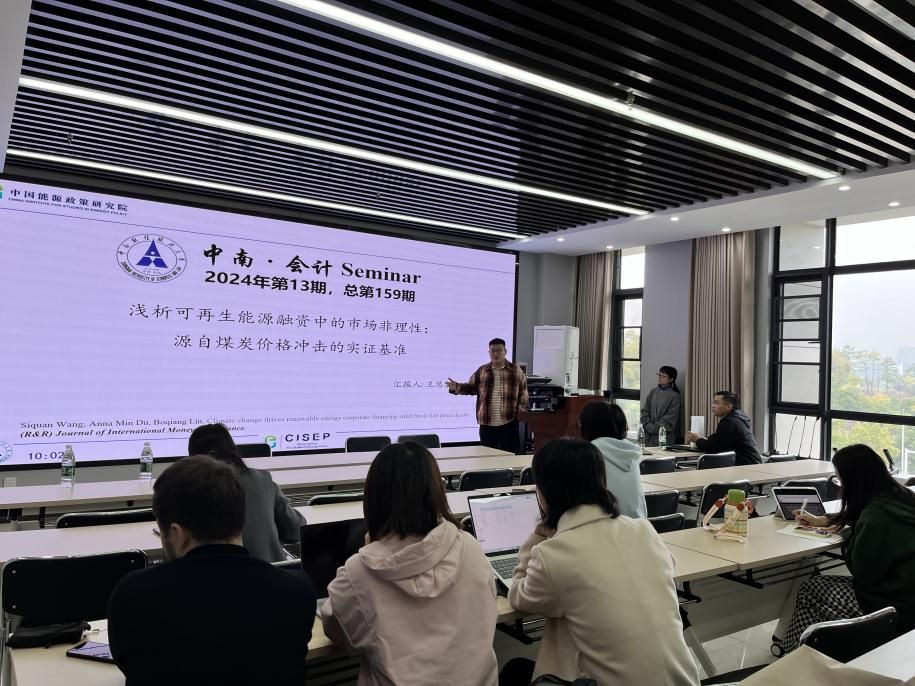 2024年11月22日星期五上午10:00至11:30,米兰电竞·(中国区)会计学院第159次“中南·会计Seminar”学术讲座在文翰楼北406成功举办。本期讲座由郭俊杰副教授主持,特邀厦门大学李旻旸博士就其研究成果《中国新能源行业迅猛增长的微观机制:业务扩张与融资可获得性》以及王思泉博士就其研究成果《浅析可再生能源融资中的市场非理性:源自煤炭价格冲击的实证基准》进行了深入分享。