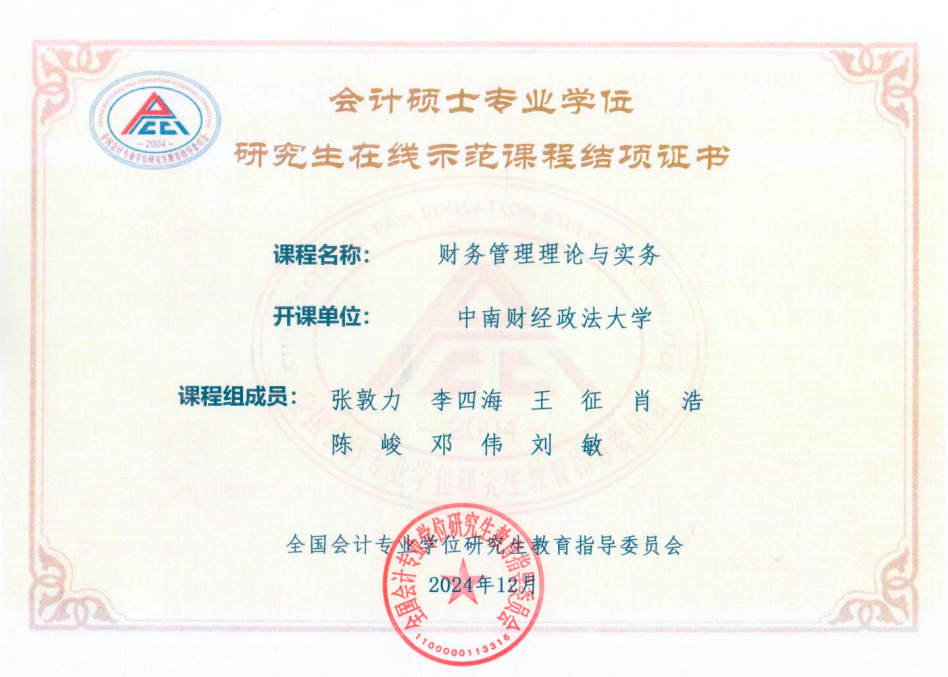(通讯员:张昭妍)近日,接到全国会计专业学位研究生教育指导委员会关于全国专业学位研究生在线示范课程结项情况的通知,我院张敦力教授牵头建设的课程《财务管理理论与实务》,陈丽红教授牵头建设的课程《审计理论与实务》均顺利通过结项评审。
