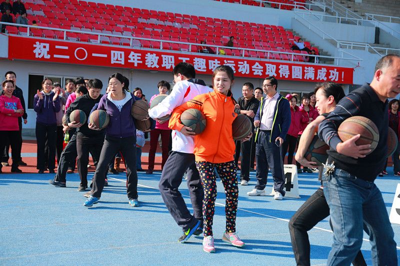 2014年11月6日,在校体育中心顺利召开了我校2014年教职工趣味运动会。此次趣味运动会由校工会、妇委会主办,校体育部协办,以增强教职工身体健康、丰富教职工文体生活,缓解教职工生活压力为主旨,采取娱乐竞赛形式进行,各二级工会800余名教职工踊跃参赛。 本次运动会设置了5个竞赛项目,分别是单人袋鼠跳、二人鸳鸯背瓜、20人迎面接力、10人时代列车、20人穿越。每一个项目集运动性与趣味性为一体,不仅是智慧与体力的角逐而且是团结与协作的完美比拼,既提高了教职工参与活动的积极性,又增进了各二级工会之间的交流。 经过激烈角逐,团体总分第一由校直机关代表队夺得,各项目第一名分别是:袋鼠跳女子组:金融学院杨梅、袋鼠跳男子组:校医院江勇、鸳鸯背瓜:新闻学院、时代列车:体育部1队、迎面接力:财税学院、穿越:图书馆。