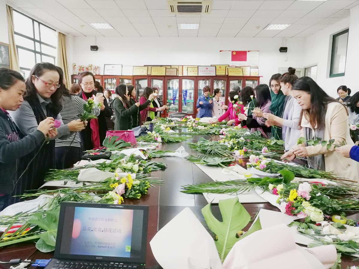 花艺老师利用PPT图文并茂地介绍了鲜花常识、保养与摆放,插花艺术的讲解,向老师们传授基本的家居插花技巧,教工对此兴趣极高,不断地提问交流。在自主创意插花环节,教工们大展身手,积极与老师讨论交流,充分发挥才智,创作出了属于自己的手捧花。活动最后,女教工们集体手捧鲜花,带着幸福的笑容合影留念。