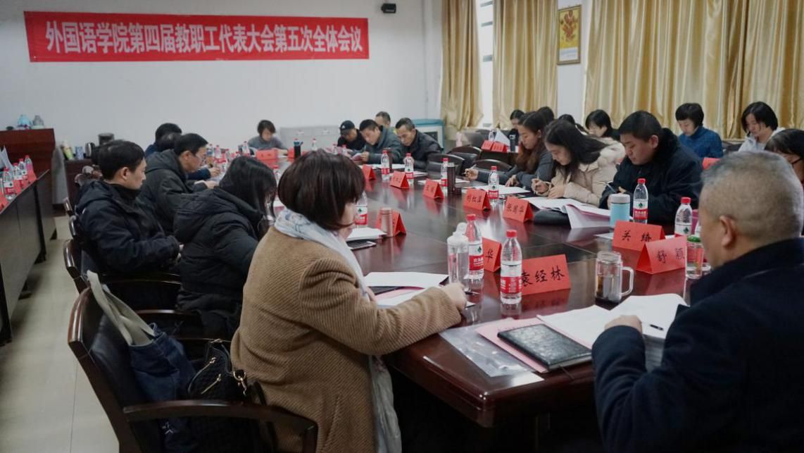 (通讯员 王博)2017年12月14日下午,外国语学院在文波楼四楼会议室召开教职工暨工会会员四届五次大会。学院领导班子成员、教职工和工会会员代表参加了会议,会议由院教代会主任李剑波教授主持。王革院长分别作外国语学院2017年工作报告和财务报告,工会主席伍施乐作2017年工会工作报告,学院教职工代表现场听取并审议了以上报告。