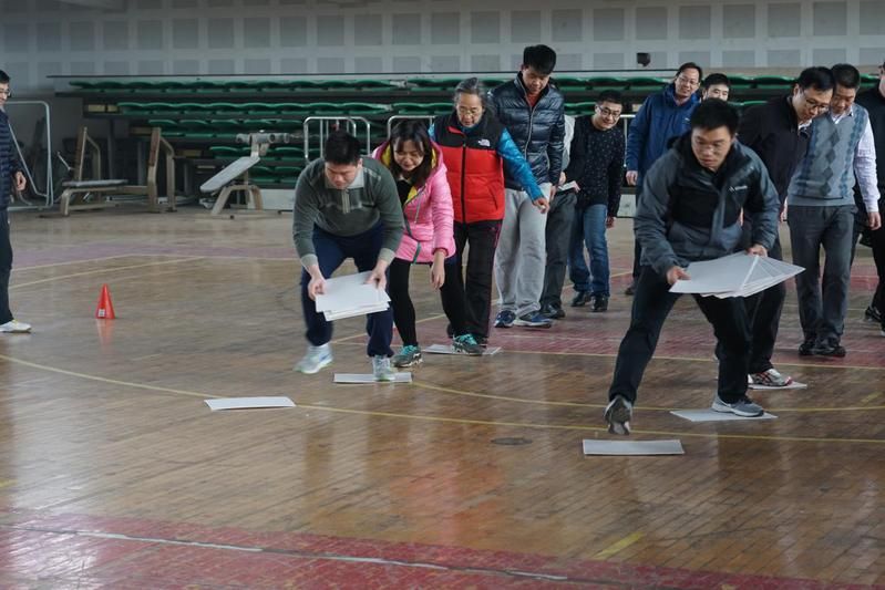 接着,有趣的摸石头过河比赛在教职工的欢笑声中欢乐上演。比赛中,六组参赛老师们每8人为一组,他们将手中的9块纸板依次传递组成“道路”,供组员“过河”。比赛现场竞争激烈,呐喊助威此起彼伏,参赛老师们齐心协力,默契配合在铺出的“道路”上大步“过河”,赢得了阵阵掌声。最终农经与物流联合代表队、人力资源管理系代表队、行政代表队分别获得了前三名。