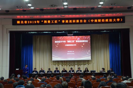 新闻网讯(学生记者 屈颖 摄影 张亚)11月18日下午,湖北省2019年“荆楚工匠”事迹巡回报告会在文泉楼报告厅举行。湖北省总工会党组成员、副主席刘建宇,宣教部部长王华虎,教科文卫体工会副主席赵黎出席。报告会由我校党委副书记、纪委书记侯振发主持。