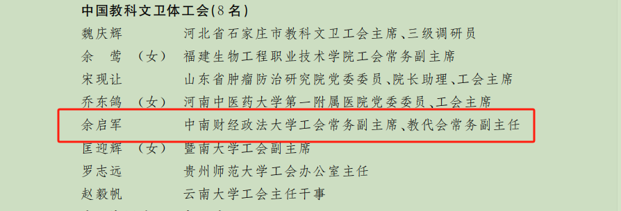 新闻网讯(通讯员 尤军)日前,中华全国总工会发布《关于表彰全国模范职工之家 全国模范职工小家 全国优秀工会工作者的决定》,对全国基层工会先进集体和个人进行表彰,我校工会常务副主席余启军获“全国优秀工会工作者”称号。
