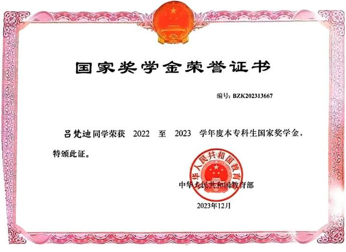 吕梵迪同学怀揣着对财政学专业极大的热情,勤奋学习,认真钻研,夯实专业基础。入学以来,她始终做到严谨自律,秉持一丝不苟的学习态度,认真对待每一门课程。前五学期加权平均成绩94.69,位列专业第一,所修课程中56门课程满绩,连续两年综合成绩专业第一,获2022—2023、2023—2024学年国家奖学金。