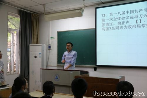 4月21日下午2:30,由法学院2015级团总支举办的党史党情知识竞赛在首义校区文泽楼104举行,法学院2015级50名入党积极分子分为6个小组参加比赛。部分班团学生干部旁听了比赛,2015级辅导员白雷老师出席活动。