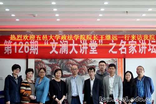 通讯员(张娟 李凯丽 柯炜娜 刘璇)4月28日,广东省五邑大学法学院院长王继远教授一行来访我院,法学院院长徐涤宇教授,民商法系副主任孟令志副教授,法律援助与保护中心副主任韩桂君副教授,教学办主任付晓老师,学工办主任郝新春老师和法学实验中心孙艺老师一同在文治楼六楼会议室热情接待。