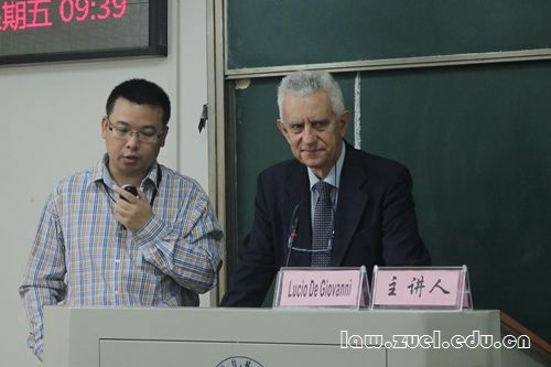 5月19日上午9点半,法学院研究生创新课程暨中意法学研究中心罗马法高端课程第四讲,于文添楼108教室开讲,此次课程主题为后古典时期法学的基本特征,由Lucio De Giovanni教授进行讲授,由四川大学徐铁英副研究员担任翻译,多名研究生到场聆听。Lucio De Giovanni教授,意大利拿波里费德里克二世大学法学院教授、院长,同时是后古典研究中心成员,意大利法史协会会员,后古典国际研究中心学术委员会委员,我院郑祝君教授在讲座中担任主持人。