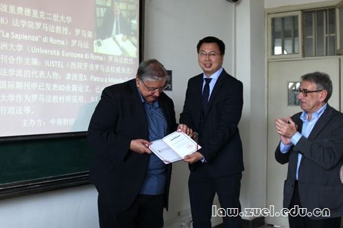 5月24日上午,法学院研究生创新课程暨中意法学研究中心罗马法高端课程第七讲,在我校文添楼312教室进行,主题为“诉讼,程式和程式的组成部分”。本次课程主讲人为Antonio Palma教授。我院理论法系Ivan Cardillo老师担任主持人,山东财经政法大学法学院李云霞老师担任翻译。