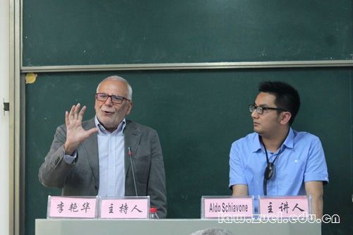 5月19日下午,法学院研究生创新课程暨中意法学研究中心罗马法高端课程第五讲,在文添楼307教室开讲,本次讲座的主题为“古罗马法学家及他们的学派”,由欧盟罗马法科研项目负责人,欧洲罗马法泰斗Aldo Schiavone教授主讲,张长绵老师担任本次讲座翻译,多名师生到场聆听。
