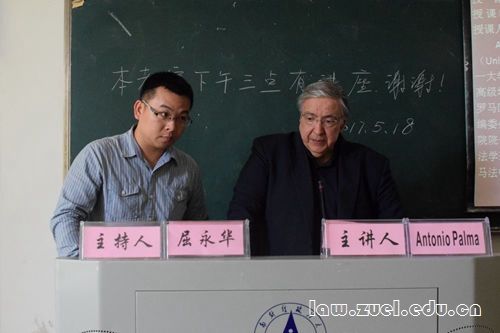 5月18日下午,我校法学院研究生创新课程暨中意法学研究中心罗马法高端课程第三讲“争鸣法学”于文添楼201举行,意大利拿波里费德里克二世大学法学院罗马法教授、罗马第一大学罗马法高级培训班特聘教授Antonio Palma教授担任主讲人,四川大学法学院徐铁英副研究员、华东政法大学法学院张长绵老师、法学院理论法学系罗鑫老师出席此次讲座,我校众多研究生到场聆听。