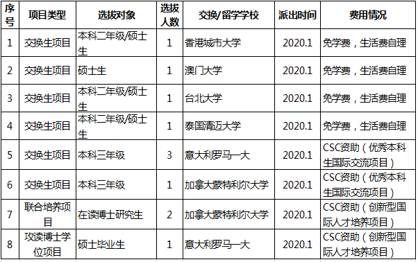 2019年下半年,法学院将集中安排学生出国(境)项目的选拔工作。选拔的项目包括:香港城市大学交换生项目、澳门大学交换生项目、台北大学交换生项目、泰国清迈大学交换生项目、日本神户大学交换生项目、国家留学基金委优秀本科生国际交流项目、“一带一路”中意法学创新型国际人才培养项目、新技术革命下学科融通型知识产权国际人才培养项目。项目具体信息请查阅法学院学生交流项目介绍。