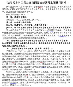 通讯员(田守顺)4月9日,根据校党委组织部要求,按照学校疫情防控和复工复学总体工作安排,结合“4·15” 全民国家安全教育日宣传教育活动,法学院党委组织全院各师生党支部通过 “党员自学+线上讨论”的方式开展了4月主题党日活动。