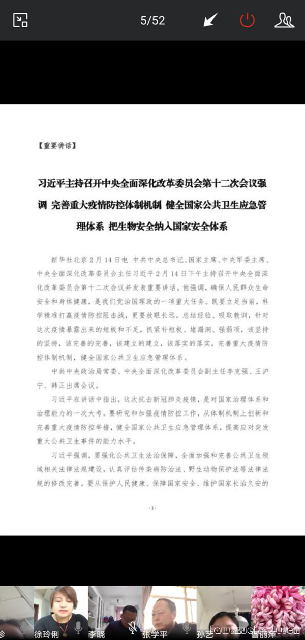 通讯员(孙艺)根据校党委工作要求,结合“4·15”全民国家安全教育日宣传教育活动,2020年4月10日上午,法学院教工行政一支部通过在线会议方式开展4月份主题党日活动,学院党委张学平书记、李晓副书记与该支部全体党员同志一起参加了本次活动,支部组织委员孙艺同志主持活动。