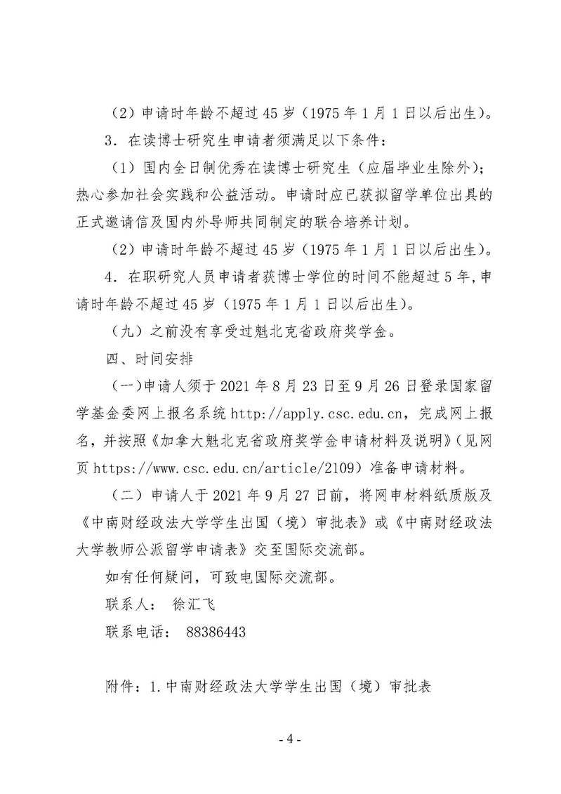 2021-2022年度加拿大魁北克省政府奖学金申报已开启。请有意申请者仔细阅读申请条件,在9月26日前登录国家留学基金委报名系统,完成网上报名,并按照相关要求准备申请材料交至法学院国际化办公室(文治楼608)。有问题请发送邮件至lawschool_zuel@163.com或拨打办公电话027-88386279咨询。