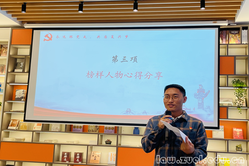 第三项,榜样人物心得分享。主讲人为民商法学2018级本科生苏正民。他讲述了自己从四川大凉山一路走来,虽艰难坎坷但自强不息,对党和社会永怀一颗感恩之心。他还结合自身生活经历,分享了所见所感、所知所行,从少数民族平等到西部大开发,再到如今自己创办的阿依助学计划,积极推动大凉山教育扶贫事业发展,倾力宣传党的各项民族政策,用实际行动践行着“落其实者思其树,饮其流者怀其源”的精神。花一般的年纪,做着花一般美好的事情,就像他说的:“我希望像索玛花一样绽放”,这也激励着在场党员以自身实际行动向榜样人物学习。