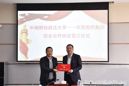 通讯员(周佳珣 李健 李霞 程璇)11月19日上午,我校与华发投控集团校企合作协议签订仪式在中原楼五楼会议室顺利举行。华发集团常务副总经理、华发投控集团总裁谢伟,华发投控集团副总裁秦军,党委书记、首席战略运营官杨振宇,党委副书记、党委办、纪委办主任吴田生,华金国际商业保理(珠海)有限公司副总经理周涛,华发集团华中区域中心负责人熊龙,华金证券湖北分公司副总经理杨华;我校党委书记栾永玉,法学院院长陈柏峰,法学院党委书记张学平,法学院党委副书记、纪委书记、行政副院长李晓,法学院党政办公室主任司志莲出席签约仪式。法学院党委书记张学平担任本次仪式主持人。